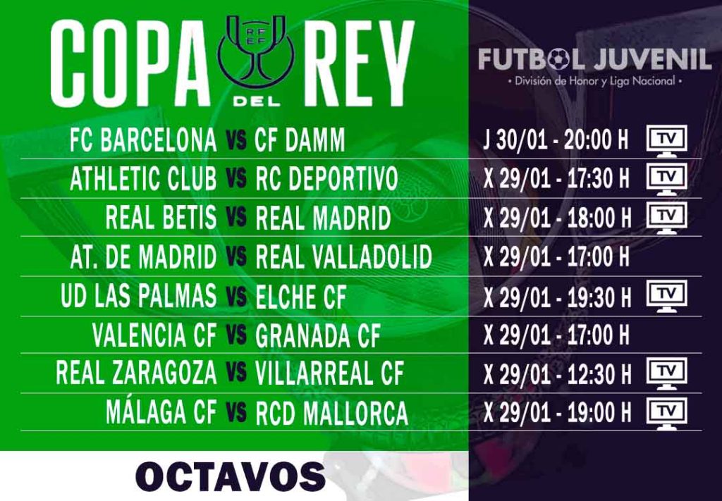 La Copa del Rey juvenil vuelve a escena este miércoles con la disputa de los partidos de octavos de final. Una eliminatoria, a partido único, que se cerrará el jueves con el derbi catalán entre FC Barcelona y CF Damm. Todos los encuentros podrán verse en directo, a excepción del Valencia CF – Granada CF y Atlético de Madrid – Real Valladolid.